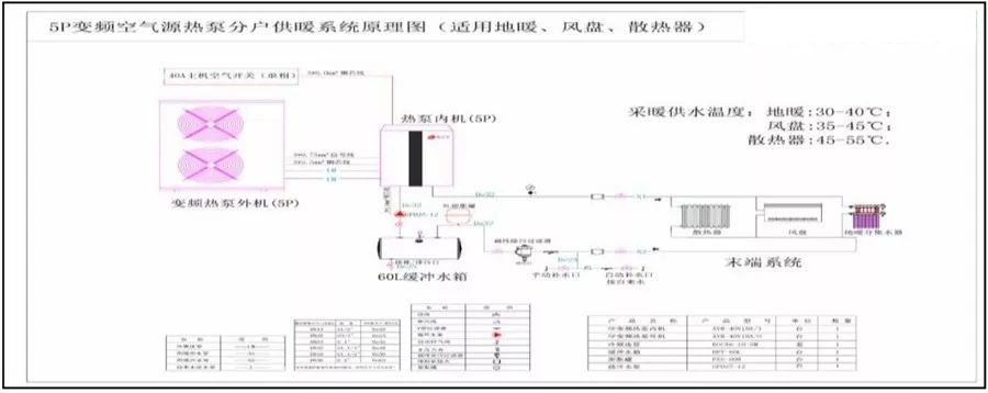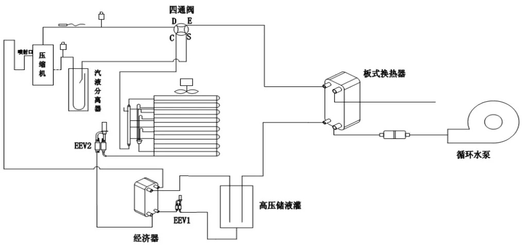 由上表可知北京延慶地區(qū)120平方米的農村居民常用戶型采暖所需熱負荷約為7.5KW,室外環(huán)境溫度為-12℃時,其制熱量約為8.65KWd的EVI變頻變水溫機組,額定制熱輸入功率為3.73KW,冬季可在-25℃的環(huán)境中正常供暖,確保山區(qū)農戶冬季采暖需求。系統(tǒng)原理圖: