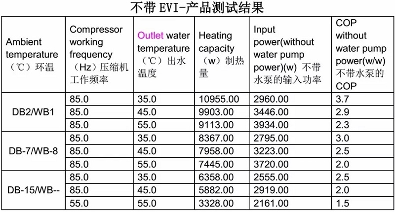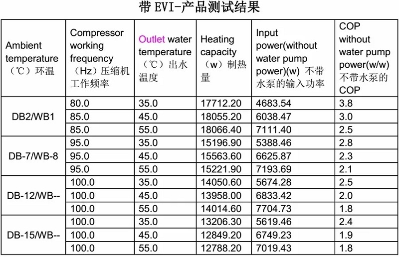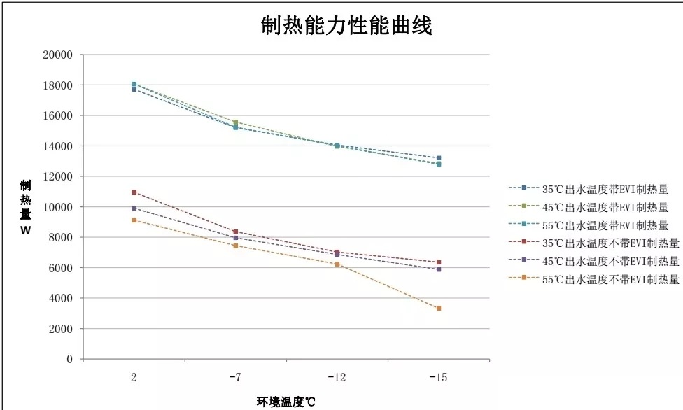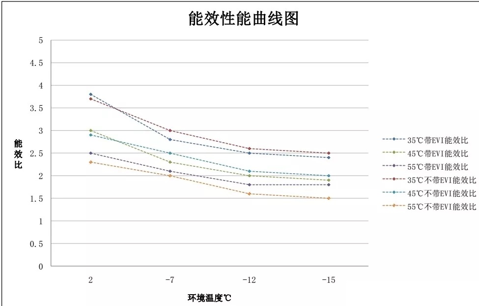 說明EVI技對低環(huán)溫下高水溫供熱,無論從能力上還是效率上都有很大幫助;