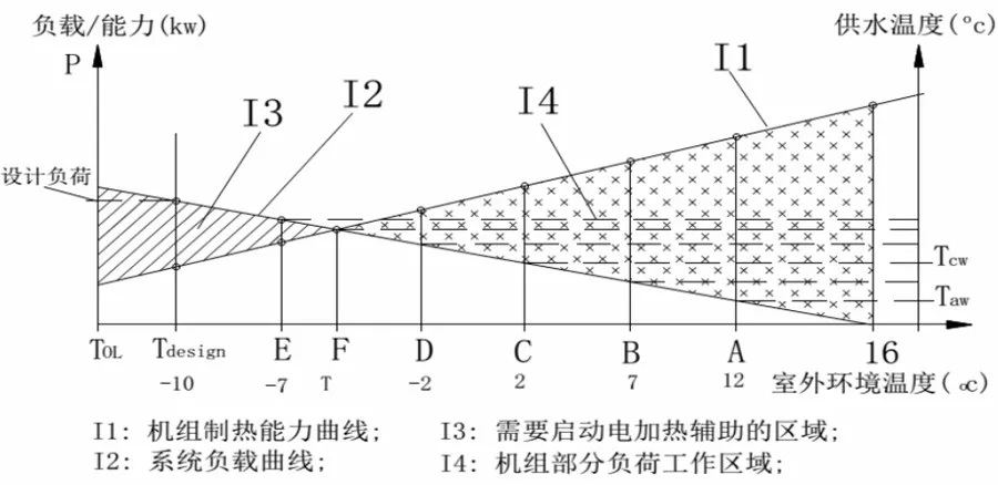 在熱泵供暖系統(tǒng)里面,調節(jié)供水溫度是最有效率的控制方式,如上節(jié)中所舉的臺機器的試驗參數所顯示的,供水溫度對熱泵的COP有明顯影響,供水溫度越高,COP越低,從上面的數據看,溫度每升高1度,COP下降約2%;下圖,是空氣源熱泵制熱能力和建筑物所需負載在不同環(huán)溫下,對比變化的一對交叉曲線,在80%以上的時間,機組工作在部分負荷狀態(tài),變頻變水溫機組,在如下幾個因素上,能大幅提高機器的綜和季節(jié)能效比SCOP:
