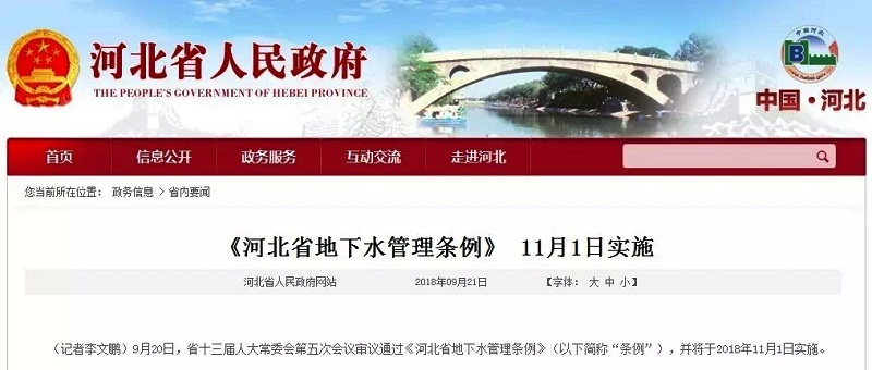 9月20日,《河北省地下水管理條例》在河北省第十三屆人民代表大會常務委員會第五次會議上獲高票通過,將于2018年11月1日實施。《條例》規定: