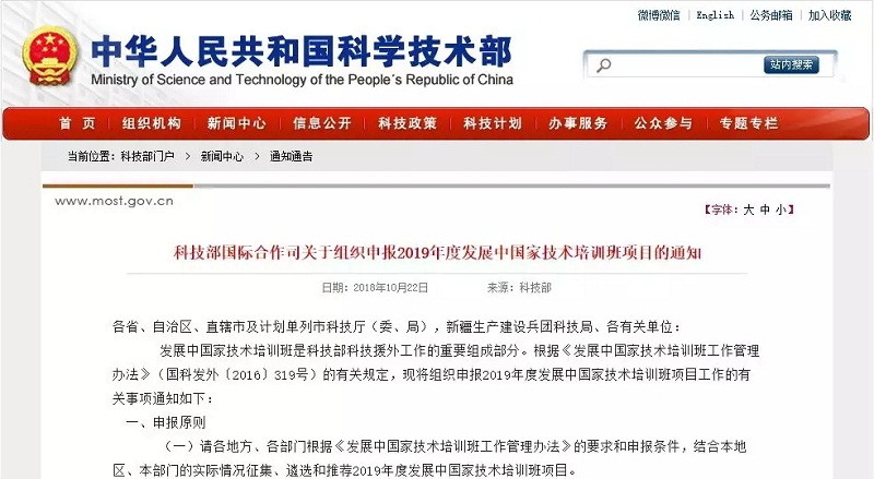 2018年9月30日,科技部國(guó)際合作司印發(fā)了《關(guān)于組織申報(bào)2019年度發(fā)展中國(guó)家技術(shù)培訓(xùn)班項(xiàng)目的通知》,指出申報(bào)重點(diǎn)技術(shù)領(lǐng)域:2019年度發(fā)展中國(guó)家技術(shù)培訓(xùn)班項(xiàng)目擬以成熟適用技術(shù)為主體,兼顧高新技術(shù)、科技政策與管理三類(lèi)項(xiàng)目進(jìn)行支持。申報(bào)領(lǐng)域以農(nóng)林業(yè)、新能源與可再生能源、加工制造等領(lǐng)域?yàn)橹攸c(diǎn)。