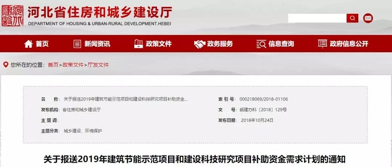 2018年10月24日,河北省住房城鄉(xiāng)建設(shè)廳辦公室印發(fā)《關(guān)于報(bào)送2019年建筑節(jié)能示范項(xiàng)目和建設(shè)科技研究項(xiàng)目補(bǔ)助資金需求計(jì)劃的通知》,指出在建筑節(jié)能示范項(xiàng)目方面,2019年省級(jí)建筑節(jié)能專(zhuān)項(xiàng)資金補(bǔ)助項(xiàng)目,原則上暫按《河北省建筑節(jié)能資金管理暫行辦法》(冀財(cái)建﹝2015﹞88號(hào))、《關(guān)于省級(jí)建筑節(jié)能專(zhuān)項(xiàng)資金使用有關(guān)問(wèn)題的通知》(冀建科﹝2017﹞34號(hào))申報(bào)。其中二星級(jí)綠色建筑運(yùn)行標(biāo)識(shí)項(xiàng)目、可再生能源建筑應(yīng)用示范項(xiàng)目(空氣源熱泵項(xiàng)目)。