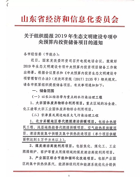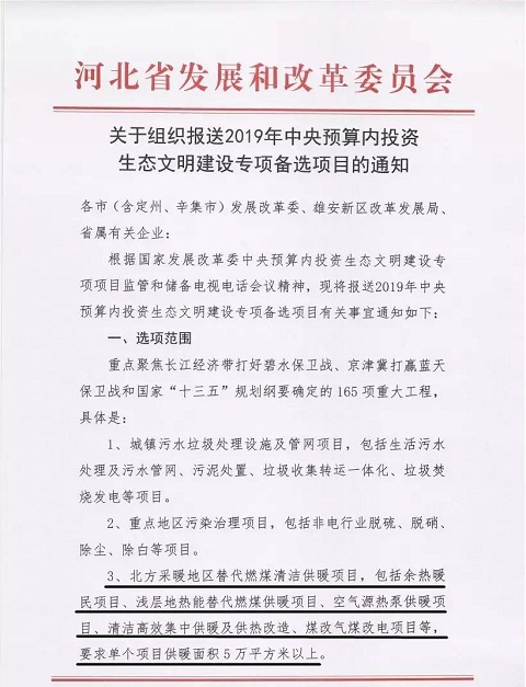 2018年7月31日,河南省發(fā)展和改革委員會(huì)印發(fā)《關(guān)于組織申報(bào)2019年中央預(yù)算內(nèi)投資生態(tài)文明建設(shè)專(zhuān)項(xiàng)備選項(xiàng)目的通知》,指出專(zhuān)項(xiàng)備選重點(diǎn)為北方采暖地區(qū)替代燃煤清潔供暖項(xiàng)目,主要包括余熱暖民工程、淺層地?zé)崮芴娲济汗┡?xiàng)目,空氣源熱泵供暖項(xiàng)目,清潔高效集中供暖及集中供熱改造項(xiàng)目,單個(gè)項(xiàng)目的供暖面積要達(dá)到5萬(wàn)平方米以上。