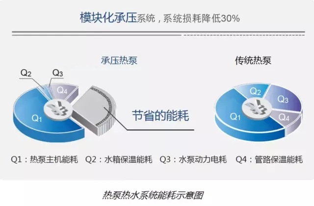 更為重要的是,在系統層面有著更為突出的節能效果:整個系統采用模塊化承壓水箱,憑借閉式系統熱水利用率高,隨用隨補等特點,系統熱水儲量僅為傳統熱泵系統的1/3左右,原廠生產的水箱保溫性能也遠優于普通開式水箱,因而系統散熱損失大大降低;承壓水箱在供水時也無需對熱水進行增壓,系統中水泵的電耗也大大減少。系統綜合能耗較傳統熱泵系統可以降低30%,每年可以節省一筆可觀的運行費用。