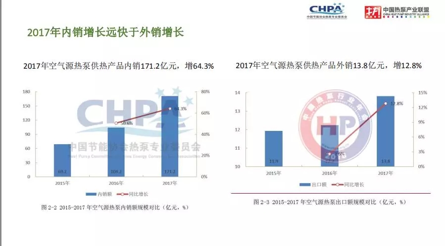 補(bǔ)充一點(diǎn),2017年我國(guó)空氣源熱泵供熱產(chǎn)業(yè)實(shí)現(xiàn)了高速增長(zhǎng),主要源于內(nèi)銷市場(chǎng)的拉動(dòng),2017年空氣源熱泵供熱產(chǎn)品內(nèi)銷171.2億元,內(nèi)銷增長(zhǎng)幅度為64.3%,2017年空氣源熱泵供熱產(chǎn)品外銷13.8億元,外銷增長(zhǎng)幅度為12.8%,主要是內(nèi)銷增長(zhǎng)拉動(dòng)整個(gè)行業(yè)的增長(zhǎng)。