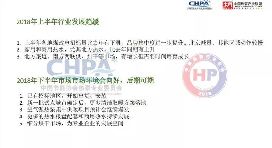 2017年我國(guó)空氣源熱泵供熱產(chǎn)業(yè)取得非常好的成績(jī),但是在2018年上半年行業(yè)發(fā)展趨緩,整機(jī)制造企業(yè)壓力非常大,源于2018年上半年煤改電的招標(biāo)總量與去年相比有所下降,品牌的集中度迅速提高。具體北京地區(qū)冬季清潔取暖工程空氣源熱泵產(chǎn)品市場(chǎng)需求量比去年有所降低,河北、山東、山西等其他區(qū)域工作開(kāi)展比較慢,且市場(chǎng)比較分散,給空氣源熱泵整機(jī)企業(yè)帶來(lái)非常大的壓力。但2018年后半年市場(chǎng)環(huán)境會(huì)向好,市場(chǎng)前景依然可期。尤其是北方地區(qū)清潔取暖新一批試點(diǎn)城市公布之后,更多的清潔取暖方案將落地。此外,空氣源熱泵集中供暖項(xiàng)目在2018年后半年也將迎來(lái)市場(chǎng)旺季,集中供暖市場(chǎng)將為商用低溫空氣源熱泵機(jī)組等產(chǎn)品帶來(lái)市場(chǎng)會(huì)在后半年持續(xù)爆發(fā)。在生活熱水領(lǐng)域,越來(lái)越多的精裝樓盤(pán)選擇使用空氣源熱泵產(chǎn)品實(shí)現(xiàn)生活熱水的配套,還有就是細(xì)分的烘干市場(chǎng),如淤泥、煙業(yè)的烘干市場(chǎng)都將為專業(yè)空氣源熱泵企業(yè)提供良好的細(xì)分的發(fā)展空間。