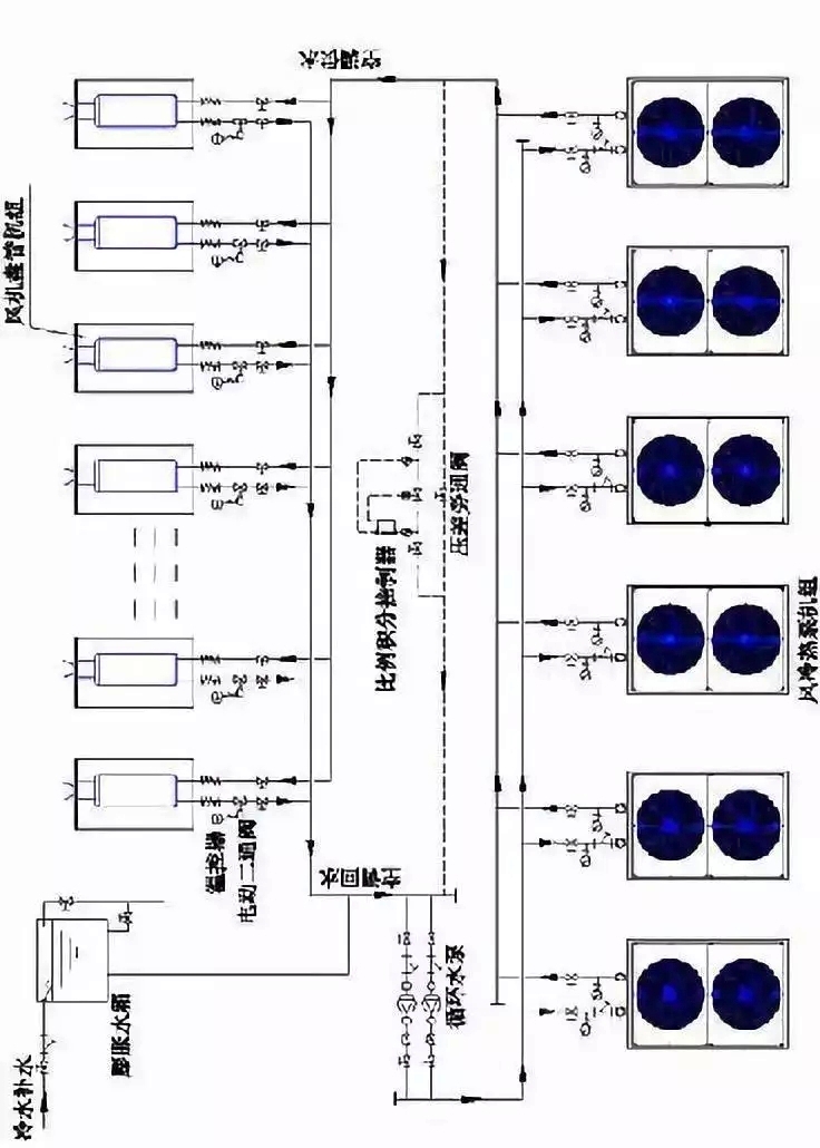 空調(diào)水系統(tǒng)為一次泵變流量、雙管制系統(tǒng),系統(tǒng)干管采用異程式。每層水系統(tǒng)的回水干管上設(shè)置平衡閥。每臺風(fēng)機盤管機組的回水管上設(shè)計電動二通閥。風(fēng)機盤管的供水量控制由室內(nèi)溫控器按所需的室溫來控制。空調(diào)冷熱水系統(tǒng)定壓補水裝置采用高位的膨脹水箱。