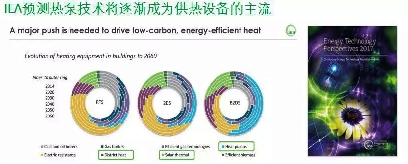 如上圖所示,在國際能源署2017能源技術(shù)展望中指出,自2014年至2060年,隨著年份的不斷推移,空氣源熱泵供熱等(Heat pumps)、太陽能(Solar thermal)、燃氣壁掛爐(Gas boilers)等主要供熱產(chǎn)品所占比重也將會發(fā)生改變,隨著空氣源熱泵供熱等應用的逐年增長,在2030年將全球氣候升溫控制在2℃以內(nèi)的總體目標就會得到逐步實現(xiàn),甚至超越目標。
